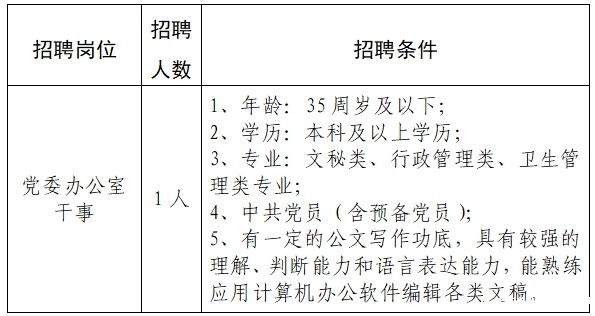 根据医院业务发展需求,现党委办公室需招聘干事1名,具体招聘条件如下: