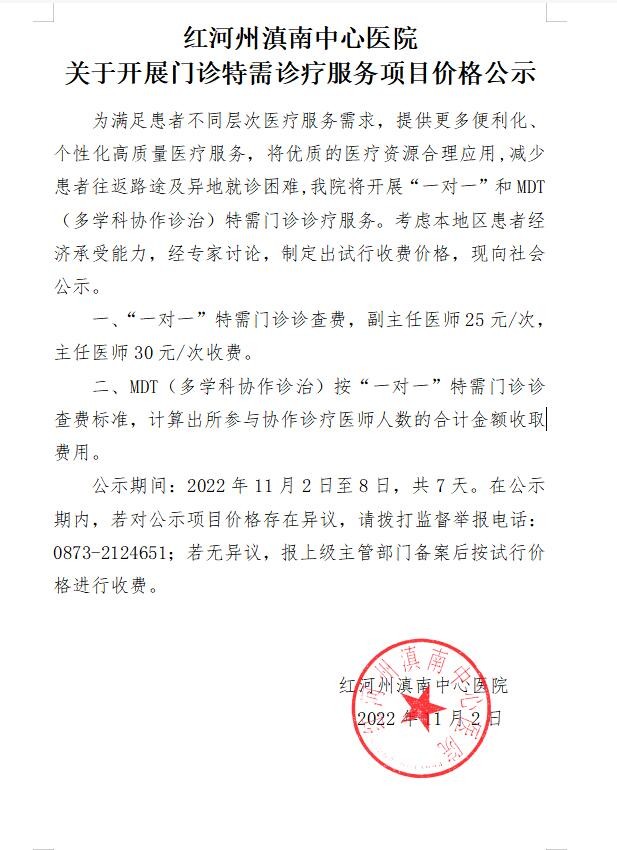 【价格公示】红河州滇南中心医院关于开展门诊特需诊疗服务项目价格公示
