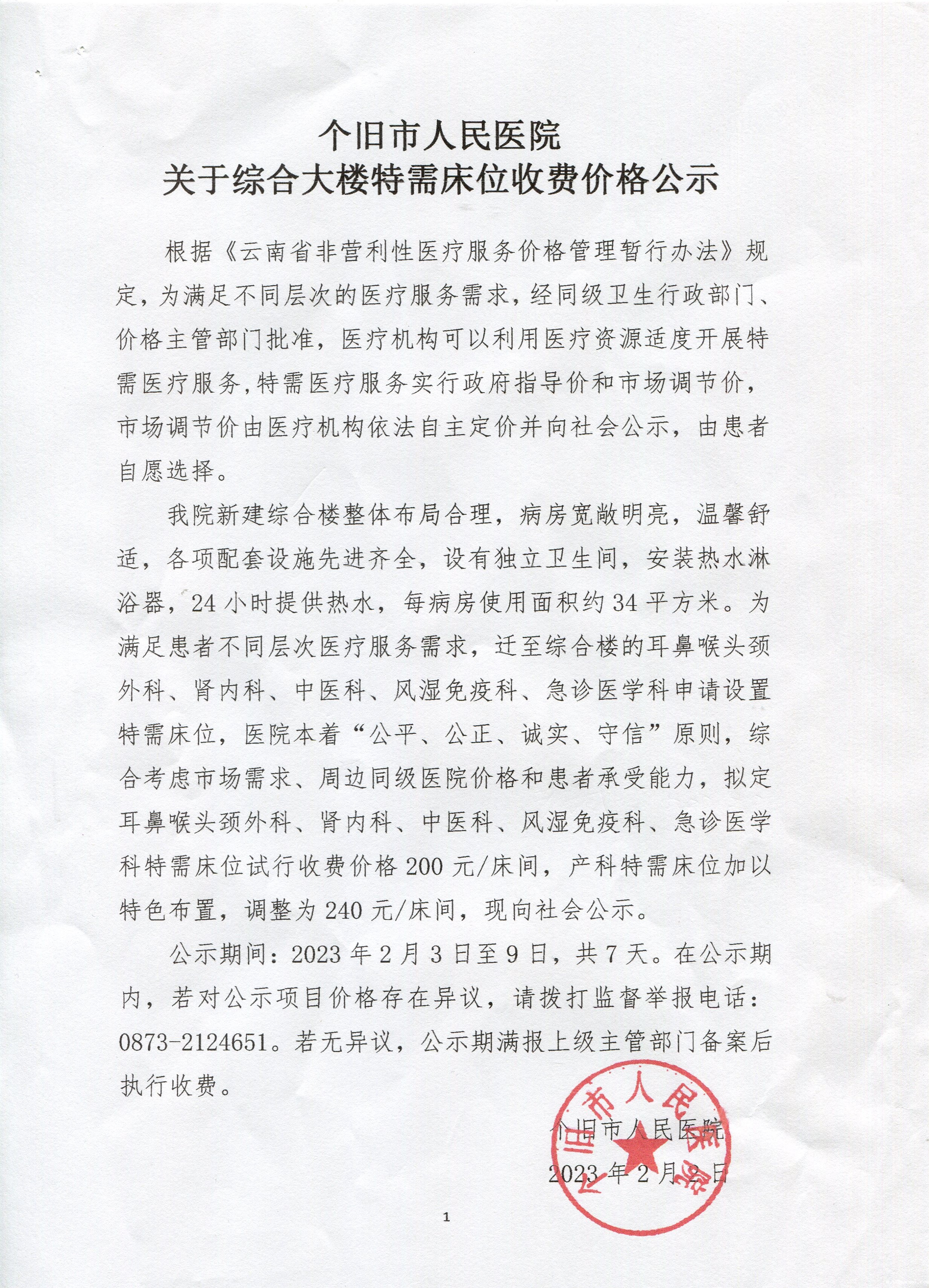 【价格公示】18luck国际关于综合大楼特需床位收费价格公示